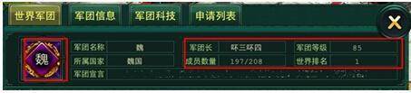 【活动规则】:军团的军团宣言中分别带有“吴”“蜀”“魏”等字样且军团等级达到15级人数≥40人且军团世界排名前20,参加活动的军团需军团长以截图(参照示例图)的形式并且根据跟帖格式在论坛活动专帖跟帖即可,如在活动期间内没有在活动专帖跟帖视为没有参加活动。