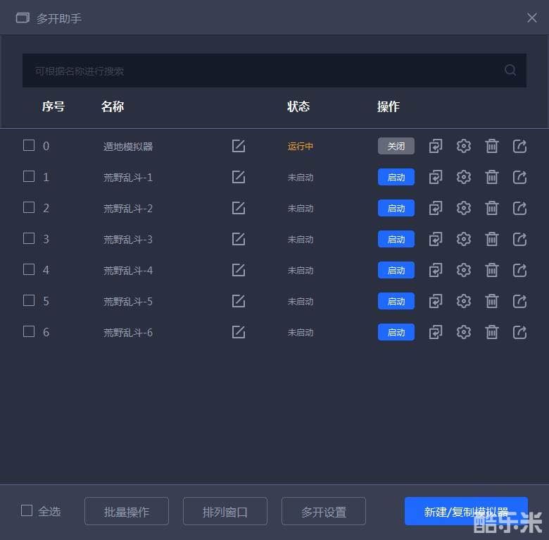 新建或复制好模拟器后,可按自己需求来配置模拟器,比如内存、核数等,点击小齿轮可设置。设置好之后返回遁地多开助手主界面,可看到之前新建或复制的模拟器都在列表里了,点击“启动”运行电脑版就好,要开几个荒野乱斗就运行几个模拟器环境。