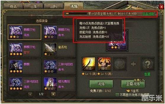 1. 累积洗炼点数,领取免费至尊洗炼次数:每累积满10点洗炼点数,即可获得1次免费至尊洗炼※ 洗炼点数获得方式