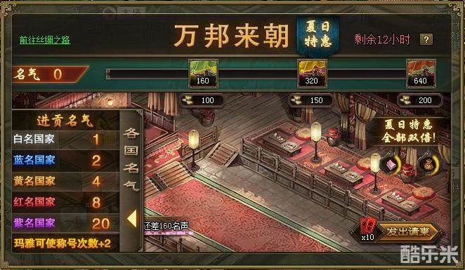 活动内容:活动期间,玩家通过发起请柬获得不同国家的进贡来获得不同数量的丝绸、西域锦囊或招商令奖励,以及提升一定的名气,当名气达到指定值时,获得名气称号,并额外赠送丝绸奖励。已拥有的珍宝数量越多,丝绸奖励越多!