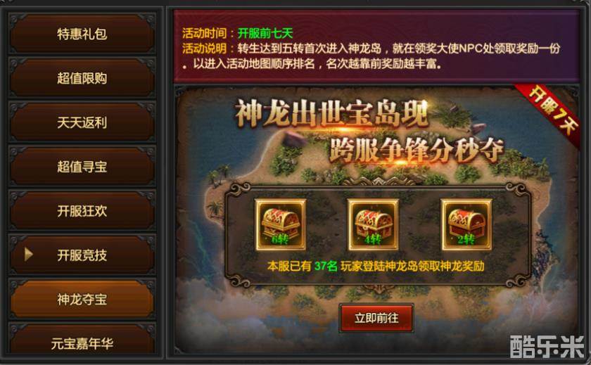 活动七:神龙夺宝活动说明:转生达到五转首次进入神龙岛,就在领奖大师NPC处领取奖励一份。以进入活动地图顺序排名,名次越靠前奖励越丰富。