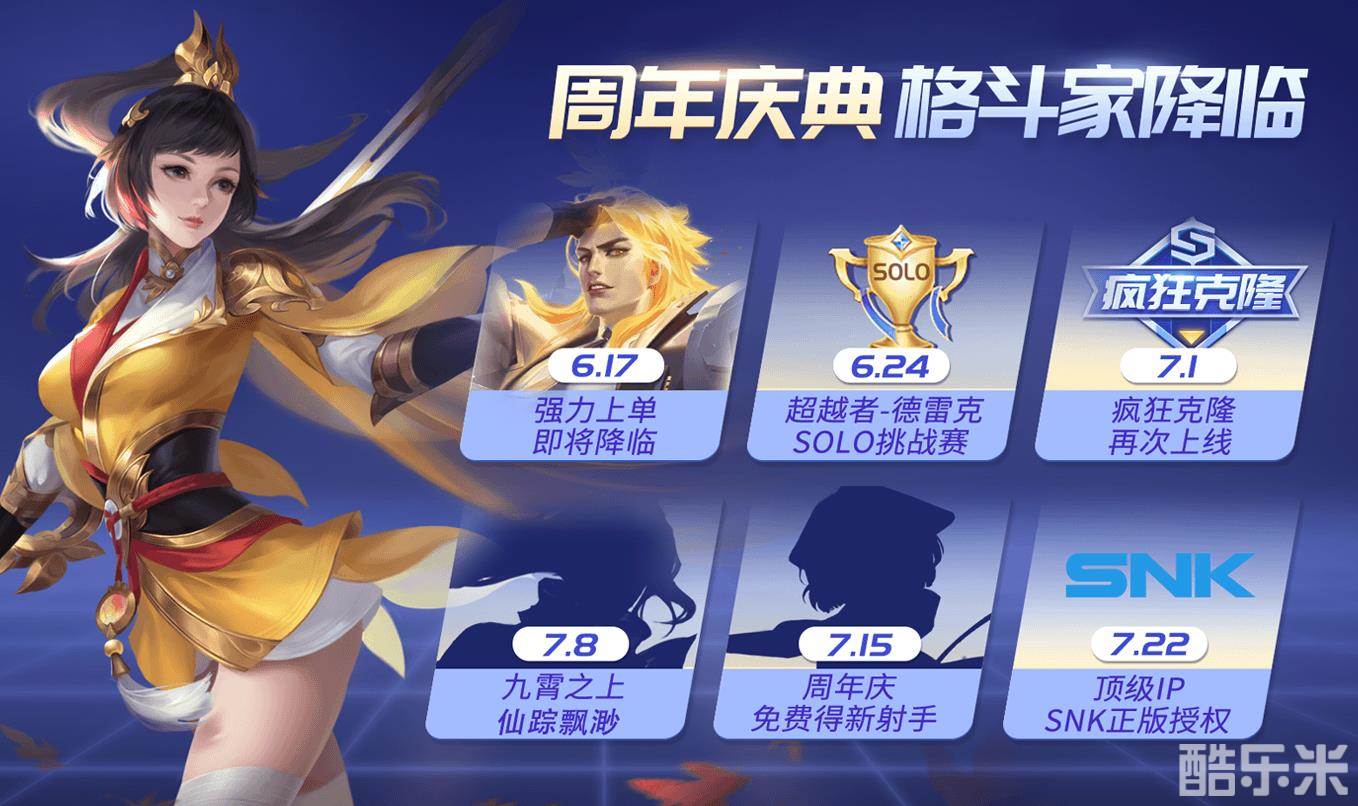 2020周年庆到来之际,我们准备了丰富的内容迎接周年庆,同时在周年庆当周还将上线免费得新射手的活动,而后更将开启与SNK顶级IP的联动,各位小伙伴们敬请期待。