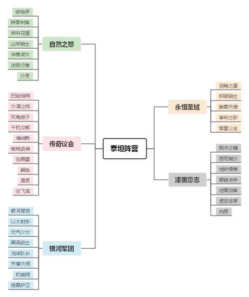 新资料片开启以后,泰坦被分为了五大阵营:自然之怒、传奇议会、银河军团、永恒圣域、漆黑意志。现有的泰坦所属阵营如下: