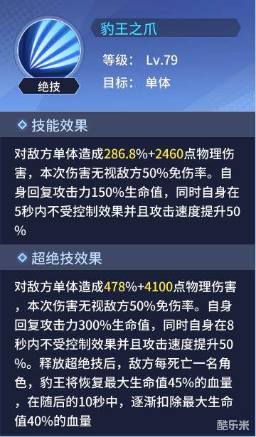 超绝技:豹王之爪。葛力姆乔•豹王作为一个攻击系前排,并不具备防御系角色的高防高免伤之类的特性,因此如果想要利用他的优点来打出理想伤害,就必须以超绝技来搭配其他角色,快速进行挨个击败,恢复大量生命,从而来维持自身脆弱的血量。