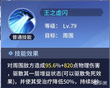 普通技能:王之虚闪。驱散技能作为游戏中仅次于免控技能的第二强势技能,出现在葛力姆乔•豹王身上,无疑是为他再镀上了一层强大的光辉,且该技能还有三个亮点:一,对周围敌方造成伤害,并驱散一层增益状态,让一些专靠BUFF生存的角色无反击之地;二,可驱散免死效果,使得靠免死承担我方炮火的角色在面对豹王时就天然弱了三分;三,其后还具有受治疗降低50%并持续8秒的效果,使得所有恢复类技能受限。综上所述,葛力姆乔•豹王的普通技能已经算是一流普通技能行列了。