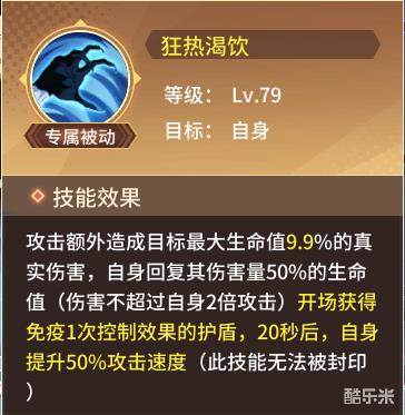 被动技能:狂热渴饮。葛力姆乔•豹王是游戏中首个普通攻击附带真伤的角色,且根据造成的伤害还能够恢复一定血量,6星后还会额外获得一次免疫控制护盾, 20秒后可增加50%攻击速度。