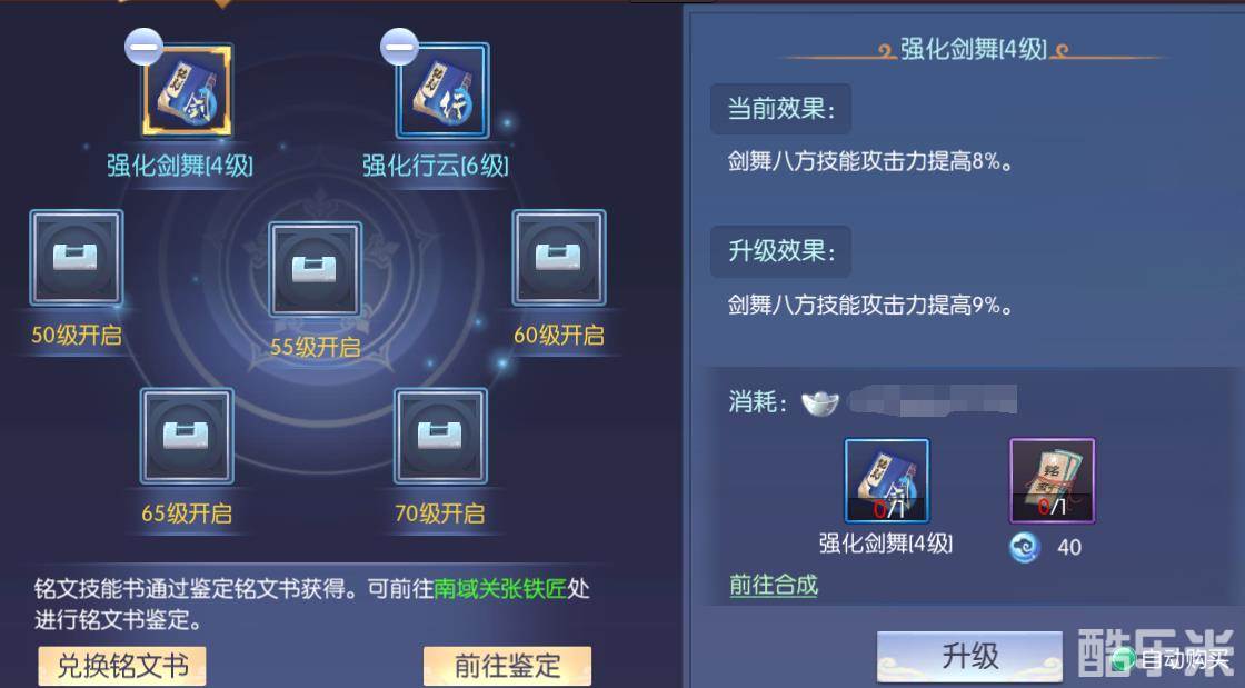鉴定完成后就可以铭刻了,共有7个铭刻位置随着等级提升逐步开放铭刻孔。只是铭刻1-2级的铭文书提升效果并不明显,只有提升到5-8级才能引起质变。这里以正剑门的行云流水为例,行云流水:对一个目标发动2次攻击,每次造成大量物理伤害,如击杀目标则再追加一次攻击。当强化行云流水的铭刻等级达到6级时,则最多可追击2个目标。这对于清场斩杀有着显著效果,本来一回合最多只能秒2,铭刻提升后就能秒3,再配上正剑门高额的单体伤害能力,绝对能够让面对他的敌人闻风丧胆。