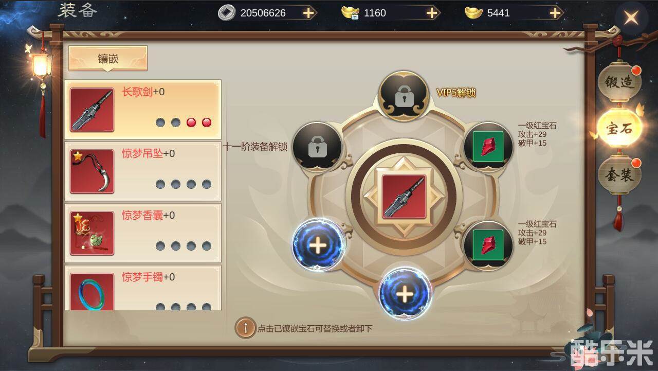 120级开启宝石镶嵌,装备一共有5个阶数镶嵌孔与1个vip镶嵌孔。可镶嵌不同类型的宝石增加属性值。