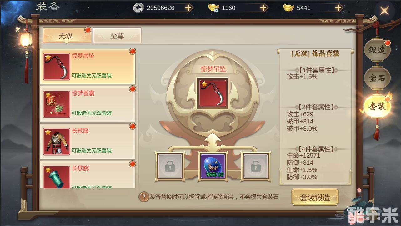 240级开启装备套装,套装分为装备无双套装、饰品无双套装、装备至尊套装、饰品至尊套装4种。激活相同套餐有可激活对应的属性。