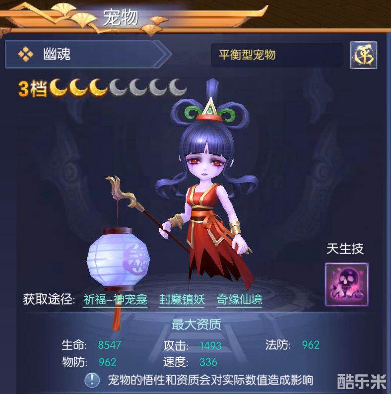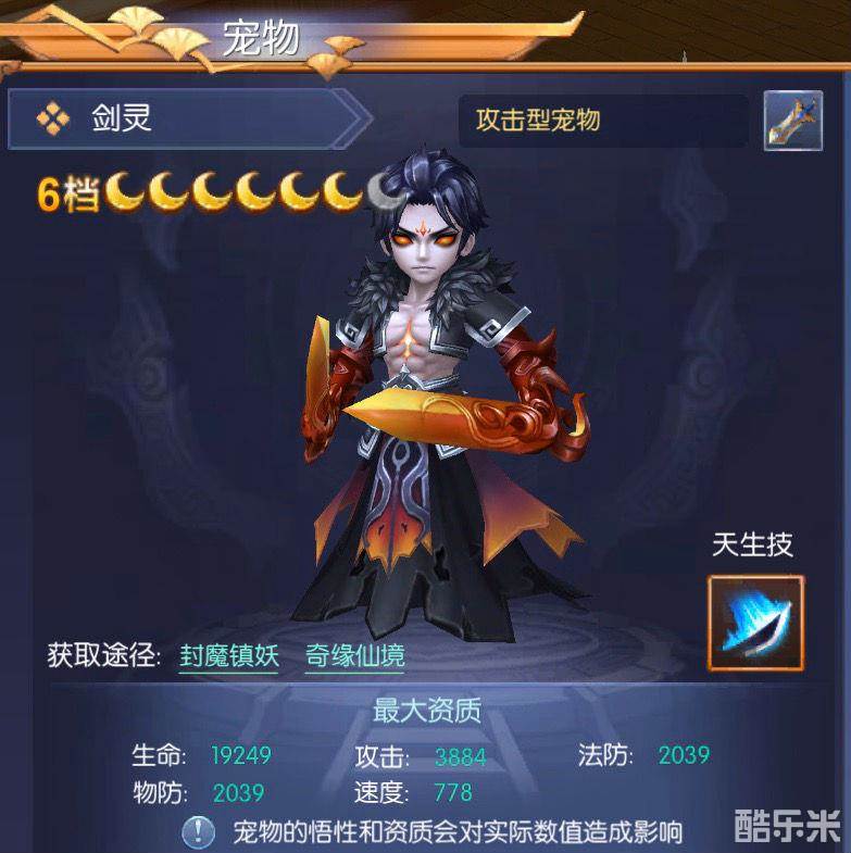 天生技能介绍:轻灵常驻技能:提升自己和主人的速度值各200点。