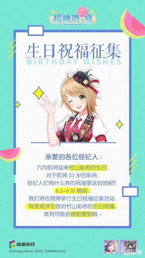 6月即将迎来AKB48 Team4村山彩希的生日,为此《樱桃湾之夏》发起了生日祝福征集活动。6.5-6.10期间召集玩家和粉丝们为村山彩希留言庆祝,并将在活动结束后将祝福传达给彩希本人。