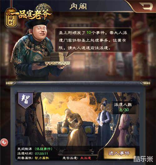 内阁规则:每日颁发多个事件,玩家可在期间派遣门客参与事件,派遣结束后根据派遣门客的总相应属性进行排名并领取奖励;