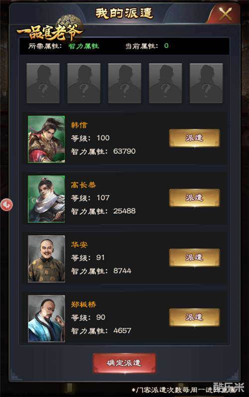每个门客每周仅可派遣1次,每周一凌晨5点重置;