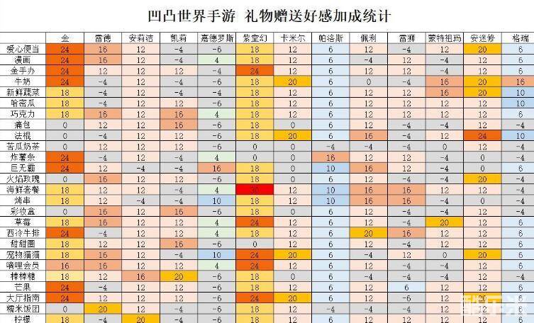 增加18点好感度:爱心便当、新鲜蔬菜、牛奶、哈密瓜、痛包、法棍、、火焰玫瑰、彩妆盒、棒棒糖、芒果、糯米饭团、巨无霸、柠檬、烤串、漫画、巧克力、草莓、西冷牛排。