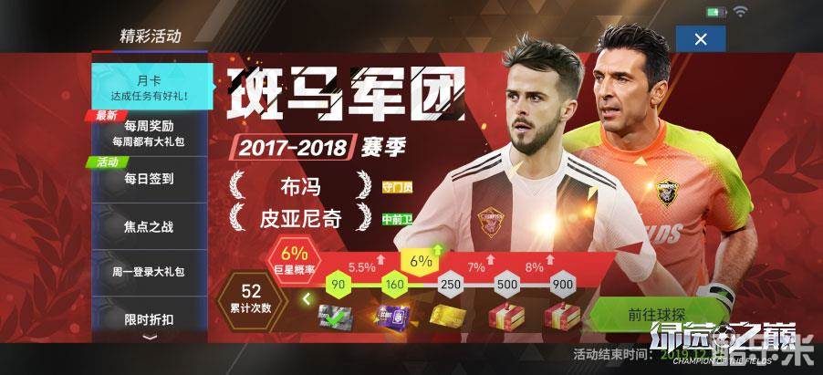 6月11日-6月17日活动期间,尤文巨星球员布冯与皮亚尼奇全新降临荣耀赛季!此次赛季冠军球探玩法依旧非常丰富,首先,本期两位球星在本次球探中被抽中的概率将提升1倍。还有重磅返利,随着玩家参与次数的提升,抽到巨星球星的概率也会随之变化,最高可提升至8%,同时还可以解锁丰厚的奖励和礼包兑换资格。值得一提的是,在返利礼包中,已开出的球员不会重复开出,玩家们不用担心开出重复的球星。