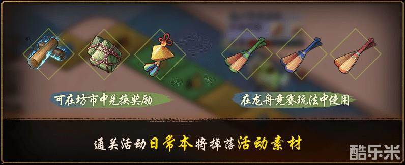 日常本还将掉落特殊资源“龙舟桨”,在随时间开启的三场龙舟竞赛中,降妖师可消耗龙舟桨参赛,并消耗其投掷骰子,让自己的龙舟在赛道中移动。赛道内分布着效果不同的赛道格子,龙舟抵达后便会触发特殊效果或特殊事件,为龙舟竞赛增添更多趣味。
