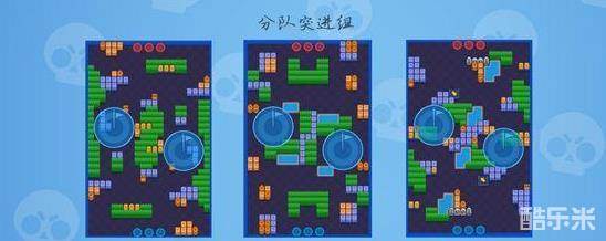 金色兵团和其乐无穷是仅有的两张单得分区地图,这意味着对抗将更加激烈。金色兵团的地图构架更加复杂,池塘和三角形建筑切割了进中道路,小队成员进入得分区只能选择狭窄的草丛小道或者从两侧绕远。当开局发现敌方有潘妮、杰西等群攻单位,要谨防前进路上被暴击。如果选择艾魅、波克等扇形群攻英雄,从左右迂回也是一个不错的选择,左侧胜在有场草丛,行迹隐秘,可以稍稍潜伏,右侧则进攻角度略好。