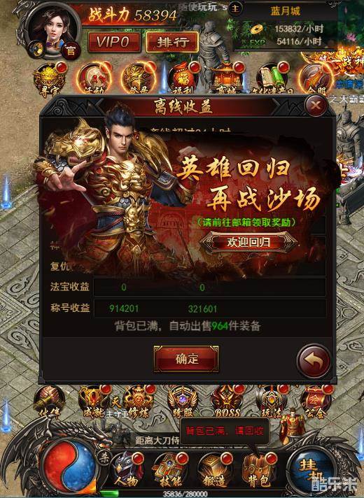当长时间没有上线,那么上线的时候会出现一个弹框,上面显示离线期间的收益,然后背包满了的时候,系统是会自动把多余无用的装备出售掉。