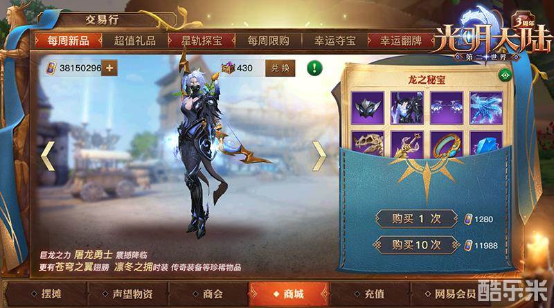 每周新品上架“龙之秘宝”,使用“龙之秘宝”将有几率获得“屠龙勇士” 时装。勇士每次购买“龙之秘宝”即可获得1个积分道具,积分可以兑换“屠龙勇士”时装等珍稀道具。上周积分道具将会失效,相应积分道具也将下架。