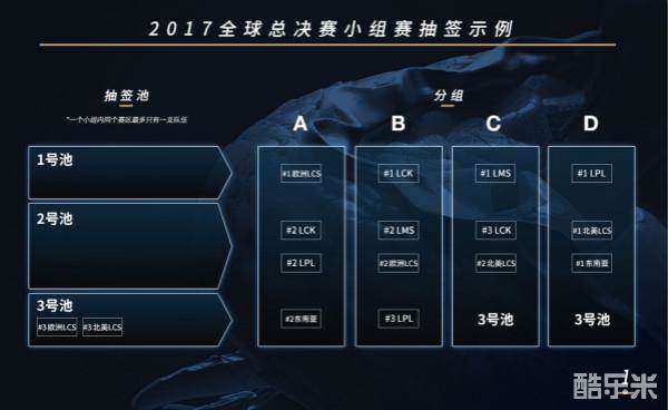 ● 每个小组中每个赛区最多只能有一支队伍。因此,举例来说,LPL 赛区的1号种子队伍和2号种子队伍不会被分在同一分组内。