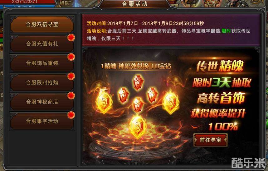 活动说明: 合服后前三天,龙族宝藏高转武器、饰品寻宝概率翻倍,限时获取传世精魄,仅限三天!!!