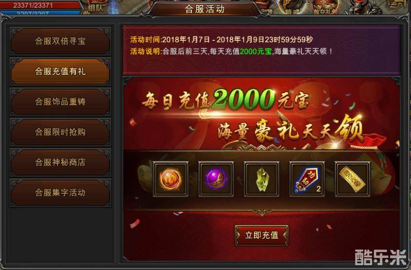 活动说明: 合服后前三天,每天充值2000元宝,海量豪礼天天领!