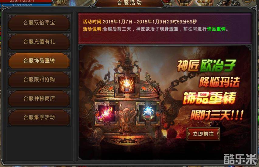 活动说明: 合服后前三天,神匠欧冶子现身盟重,前往可进行饰品重铸。