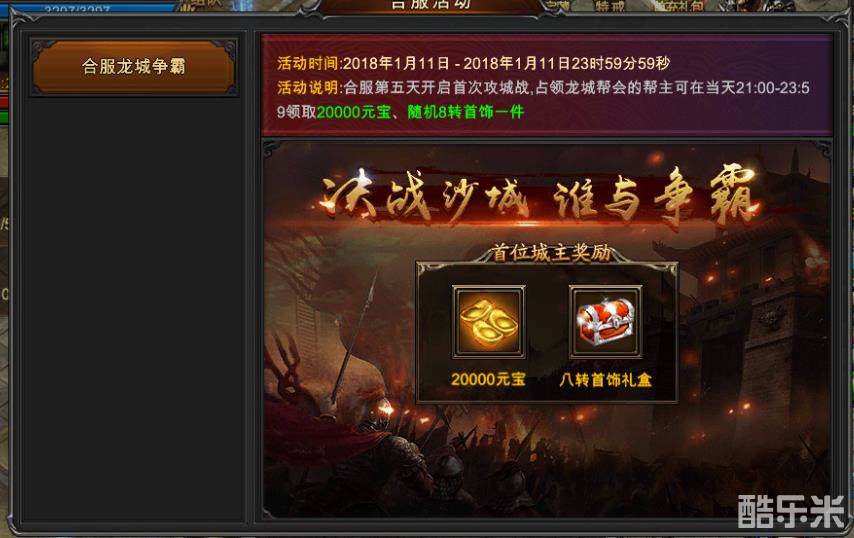活动说明: 合服第五天开启首次攻城战,占领龙城帮会的帮主可在当天21:00-23:59领取2000元宝、随机8转首饰一件