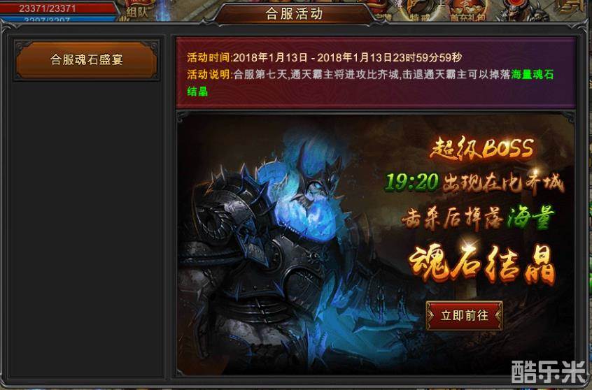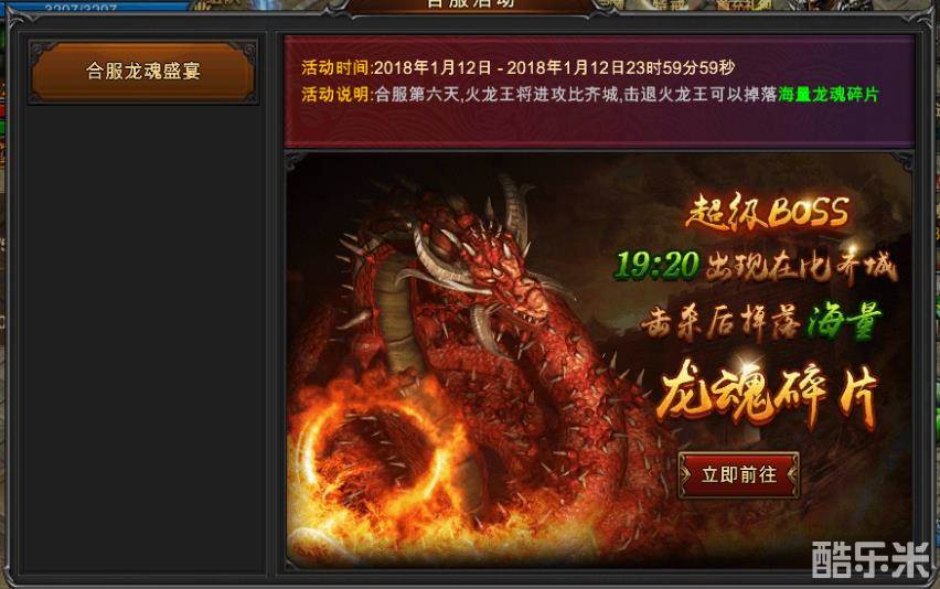 活动说明:合服第六天,火龙王将进攻比奇城,击退火龙王可以掉落海量龙魂碎片