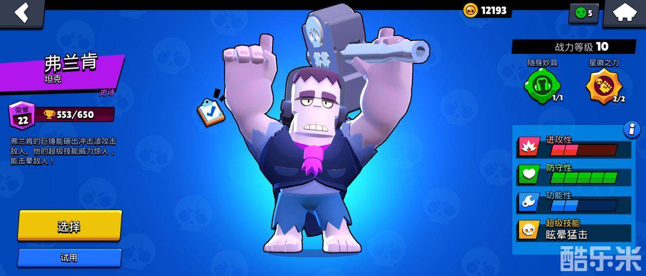 弗兰肯行动迟缓,攻击时无法移动,虽然具有很高的血量优势,但是很容易就被远程消耗。目前弗兰肯只有在足球模式中具有特别突出的作用。