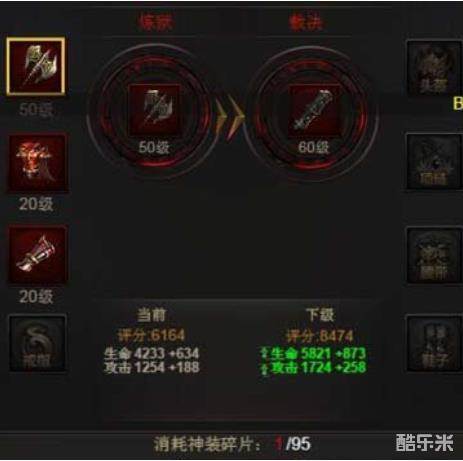 这里就是神器的玩法界面了,点击下方的升级可以消耗神装碎片来升级或者合成。如果之前没有神器,则是可以合成出符合当前等级的神装。