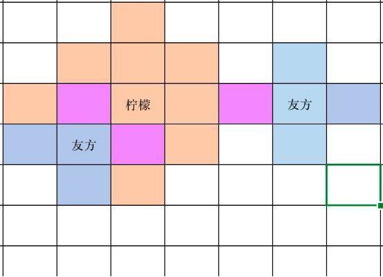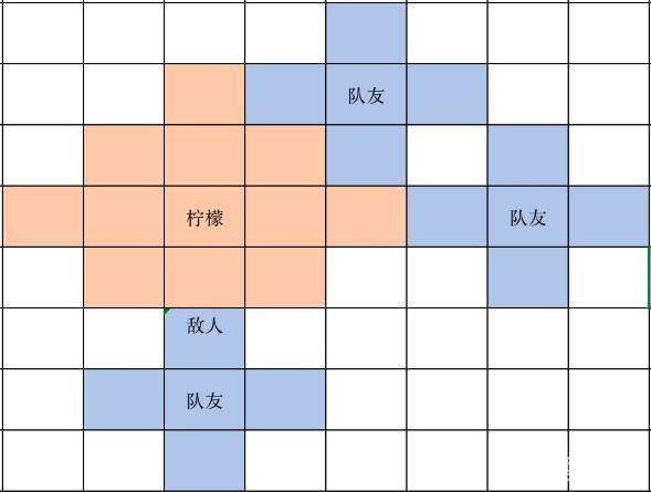 如下图1,紫色就是柠檬的专属地砖可以出现的范围,在任意队友前后左右四块地砖和柠檬可走范围的重合位置。下图2则不可以奶人,没有重合位置,唯一最下方的重合位置被敌人踩住走不了。