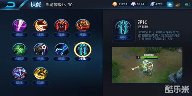 关羽这个英雄在绕后时可以为团战做出巨大贡献,但是绕后容易被敌人控制打断冲锋状态,带净化可以稳定的绕后打出控制。关羽自身只有一个解除控制的技能,在遇到多个敌人控制技能时显得有些无力,净化可以解除控制并免疫控制2秒。