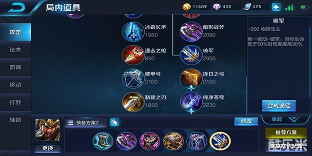 破军增加高额攻击力,非常暴力的装备,对血量低的英雄有极大威胁,对ad加成的技能,伤害会大大增加。