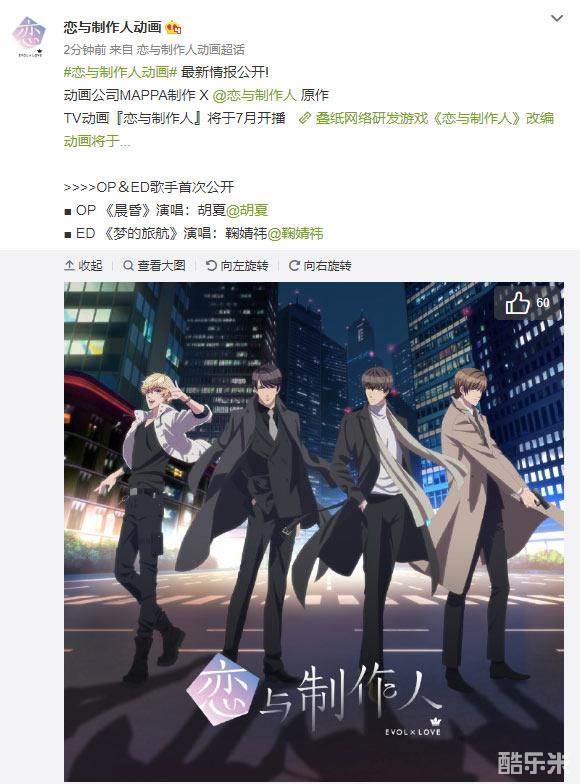首部国产恋爱游戏改编动画《恋与制作人》今日(15号)通过@恋与制作人动画宣布,动画OP&ED曲目及演唱者确定,OP曲《晨昏》将由胡夏演唱,ED曲《梦的旅航》将由鞠婧祎演唱。