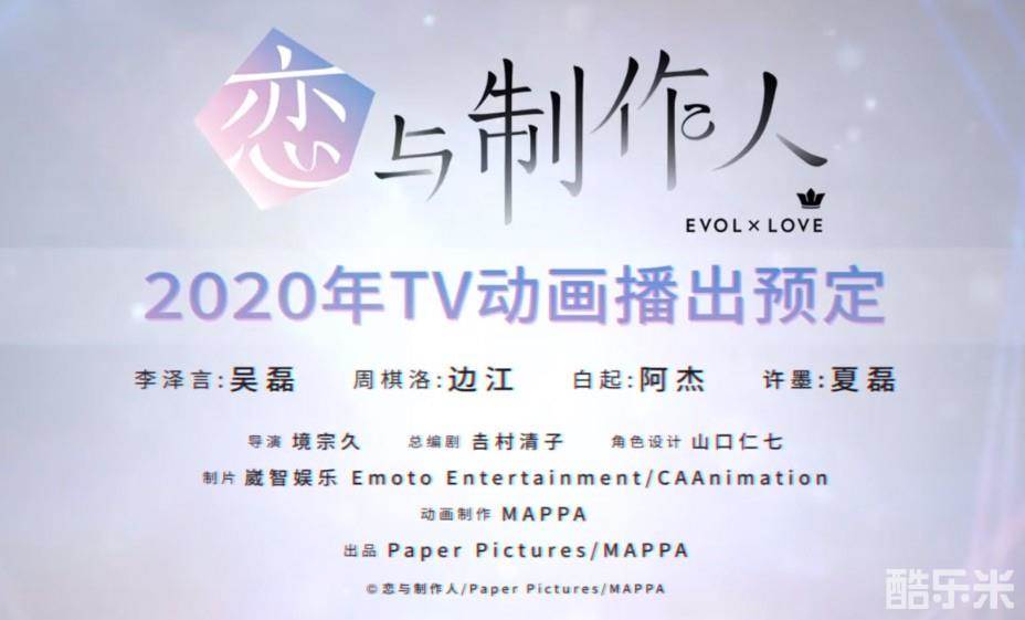 恋与动画是根据人气恋爱游戏《恋与制作人》改编,并邀请到日本知名动画制作公司MAPPA负责制作。作为首部国产恋爱游戏改编动画,自2019年7月宣布动画化决定以来备受期待。随着日本地区首播时间定档,国内的恋与制作人们是否也能在暑期迎来《恋与制作人》动画的开播?值得期待。