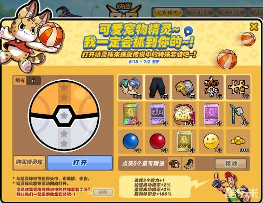 6月18日服务器维护后至7月2日服务器维护前玩家可以购买精灵球后在活动面板抽取道具。抽到第一排的道具时,会点亮一颗星,点亮5颗星后可以获得时限90天的特殊套装。第一排道具后抽取到,将会打上勾,该道具在本轮抽取中不会再次出现。集齐5颗星且接受5星奖励后,进入新的一轮,第一排的道具会重新刷新到可抽取的道具中。