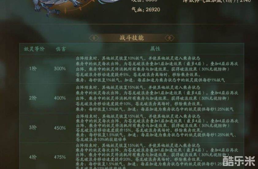 苍龙破浪舟出阵结束时,可助其他妖灵恢复一定妖气,并使它们进入乘舟状态,每秒最高恢复2%妖气,苍龙破浪舟离场时,乘舟效果结束。乘舟状态中的妖灵每次出阵,将为苍龙破浪舟叠加一层加速效果,最多可叠加四层,每层加速状态可为乘舟状态中的妖灵提供最高1.5%妖气。苍龙破浪舟达到3阶及以上时,每层加速状态还可额外为乘舟状态中的妖灵按比例提供苍龙破浪舟的技能倍率。