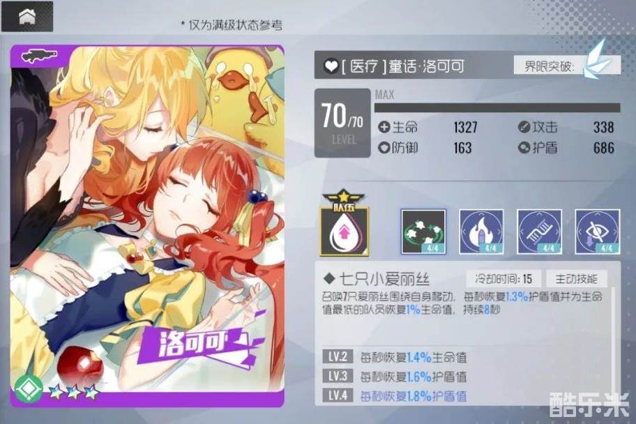 洛可可作为医疗角色,主动短cd的回血回盾非常好用,被动的召唤物比较鸡肋,本身仅靠主动也能用于佣兵续航及演习生存区回盾,但不及战术伊珂丝,生日苏小真及西洋棋格兰妮回复效果。
