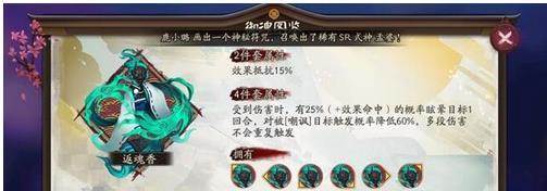 返魂香属于被动控制系御魂。虽然嘲讽时概率减小,但依然是兵佣、红屁股等式神的最优御魂选择,因为一旦触发就是两回合的连续控制,且属于不可驱散的眩晕,收益极大。