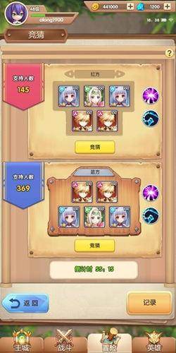 1、进入竞赛模块可以看到,本轮竞猜将对阵的双方阵容以及此时随即到的双方buff(双方自动战斗,并且阵容与BUFF随机生成),阵容左侧可以看到此时两边阵容的支持人数(玩家登入界面时刷新),下方显示本轮竞猜结束的倒计时。(如果倒计时结束,仍然在这个页面的玩家进入对战,即自动播放服务器计算结果的录像,玩家在观看完战斗后,弹出提示框提示玩家蓝方获胜或者红方获胜,如果玩家不在竞猜界面则不播放)