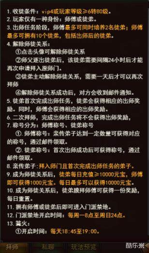 1、在玩法-门派-师徒页面,左上角页面有详细的收徒介绍及解除师徒关系介绍