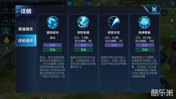 凝泪成冰:甄姬的被动技能是一个强大的控制技能,每次技能伤害都会叠加印记,当印记叠加多层时就会对敌方英雄造成法术伤害和冰冻效果,不仅在前期的中路对线时可以给自己增加了优势,而且在后期的团战时可以为我方队友创造击杀条件。