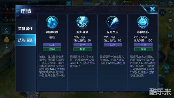 凝泪成冰:每个技能命中敌方英雄时会标记敌方,当印记叠满三层后会给敌方英雄造成冰冻效果,这个被动使得甄姬在打完一套伤害后就会给对方造成冰冻效果,如果一套技能未将敌方杀死,还可以配合队友将其击杀。