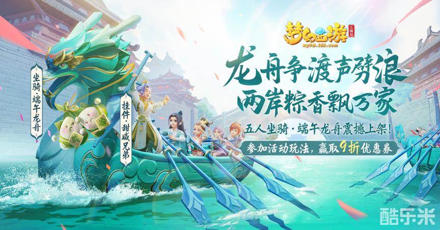 适逢传统节日“端午”,《梦幻西游三维版》龟兔游园会添加端午篇章“龙舟冲冲冲”、“粽香飘四海”,少侠可随机加入龟丞相或兔小乖阵营当中,和小伙伴水上竞逐“赛龙舟”,还有机会领取限定称谓、全新坐骑“端午龙舟”折扣券等丰厚福利好礼。