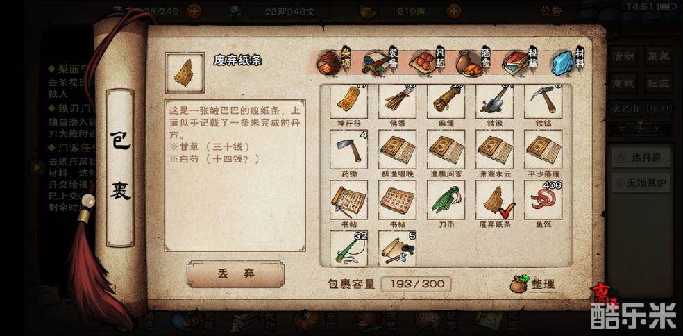 随后用火折子来当灯用,再用水上漂到(4,3)这个位置,等到水降下去就能到溶洞里面了,随后去溶洞(25,13)这个坐标位置找到机关,选择后去(10,8)位置就能发现文皇经,玩家们直接读或是用文房四宝抄走都可以。