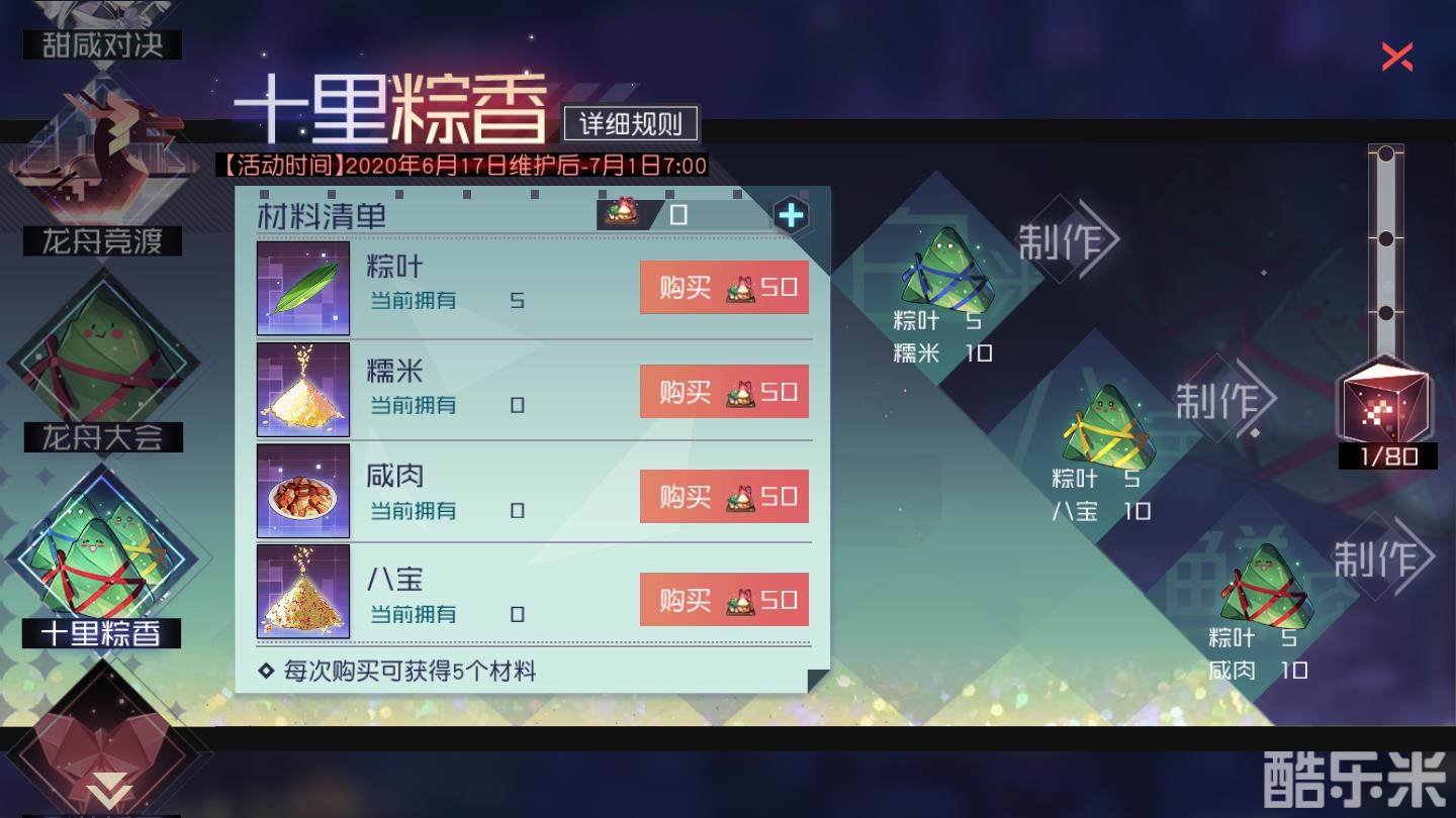 活动期间,完成每日任务,即可获得“粽子食材”。制作不同口味的粽子可以获取对应的道具奖励。同时,制作粽子总数达到一定数量时,可分别领取进度奖励。