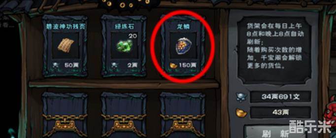 玩家们直接从洛阳鬼市就可以购买,入手一个就可以了,要是你不急先买乌缕、丹药比较好哦。今天烟雨江湖龙鳞作用讲解就为小伙伴们介绍到这里了,之后会献上更多精彩实用的有趣攻略。