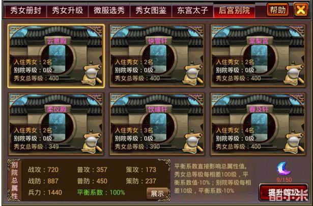 2、秀女入住别院中,可提升别院的基础属性。入住秀女的等级越高,属性也越高。
