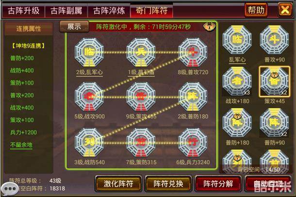 原战场界面的【同步阵型】按钮更改为【同步属性】,同步属性功能只会同步奇门阵符属性到群雄逐鹿战斗中,不会改变已经保存的布阵。